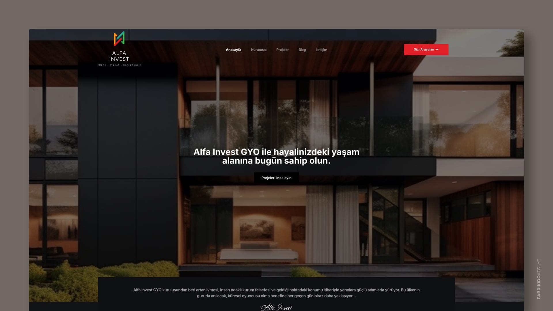 2024 yılında Alfa Pro Invest için, markanın gayrimenkul yatırım ve danışmanlık alanındaki güçlü vizyonunu dijitalde güven veren bir yapıyla sunan özel arayüz tasarımı gerçekleştirdik. Gayrimenkul alım satımı, inşaat projeleri ve danışmanlık hizmetleri; modern, sade ve profesyonel bir kullanıcı deneyimiyle yeniden kurgulandı.